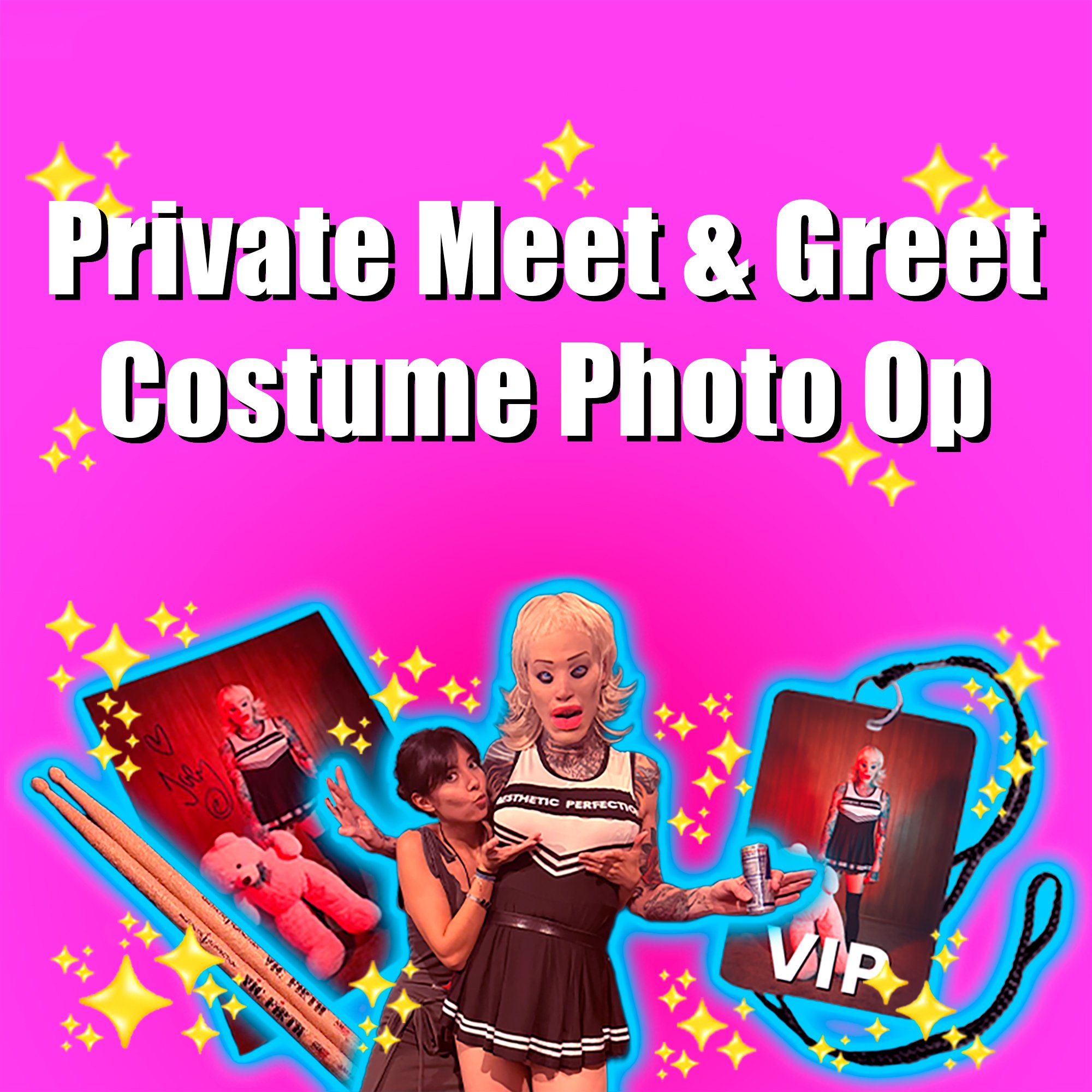that laminate is your ticket to meet up with me in the dressing room RIGHT AFTER THE SHOW to take some quick pics with me in my costume! you will also receive a signed, limited CANDY BEACHES poster, and a pair of drumsticks used at the show!